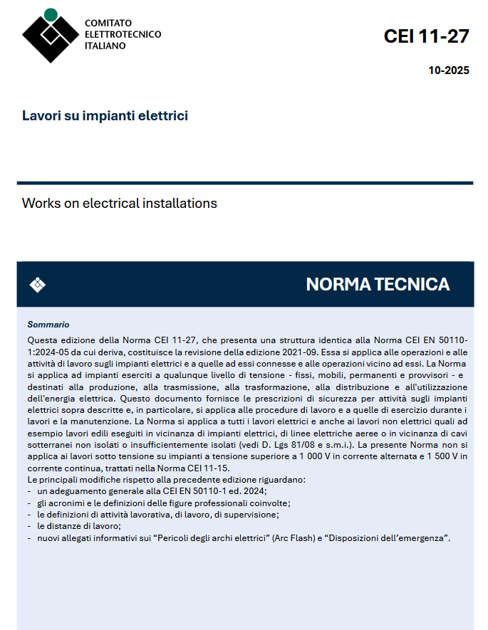 E' stata pubblicata la nuova norma CEI 11-27 (del 10/2025) che si applica alle operazioni e alle attività di lavoro sugli impianti elettrici e a quelle ad essi connesse e alle operazioni vicino ad essi.