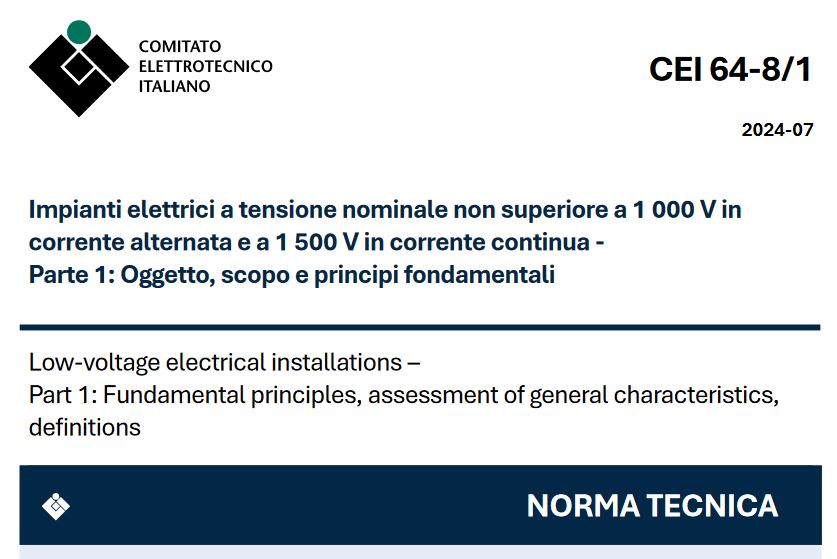 Il 1 Novembre 2024 entrerà in vigore la nona edizione della norma tecnica CEI 64-8. La norma regola gli impianti elettrici con tensione nominale non superiore a 1000V in C.A. e 1500V in C.C. e si applicherà ai nuovi impianti, agli ampliamenti ed alla trasformazione degli stessi. Si ricorda di far effettuare, tramite il Vostro tecnico esperto e competente, le verifiche periodiche previste dal paragrafo 6.5; tali verifiche, unitamente a quanto previsto dal D.L. 81/08, sono fondamentali per mantenere la sicurezza degli impianti e tutelare sia i lavoratori che il datore di lavoro.